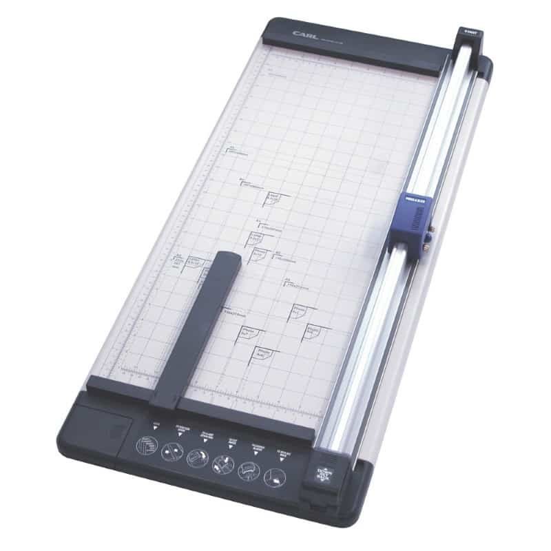 Alat pemotong kertas Size (mm): 360 x 832 x 80 Weight : 4.2kg Volume : 6kg A2, 20sheet (straigt blade), 3sheet (perforating blade)